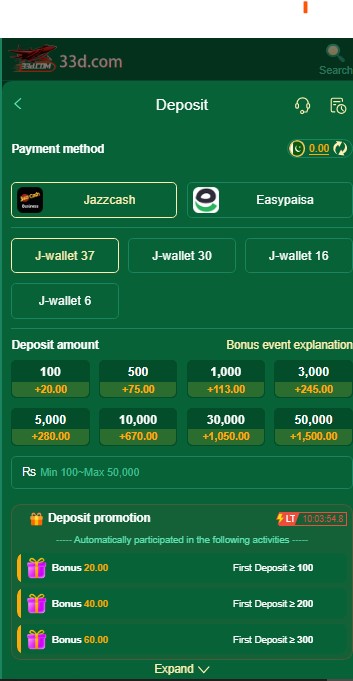 After logging in, navigate to the deposit section marked with clear currency symbols in the main menu. You’ll see available payment options prominently displayed: EasyPaisa, JazzCash, and bank transfers, each with simple icons indicating transaction speed. Moreover, select your preferred method and enter your desired deposit amount – the minimum is Rs. 400, making 33D Game accessible across economic backgrounds. Furthermore, the interface displays your potential bonus earnings for different deposit amounts, helping you make informed decisions about funding levels.