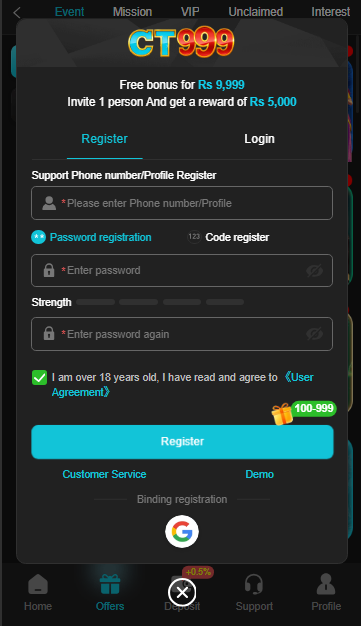 - First, download the CT999 Game APK from a trusted source. After installing the app, open it and click on the “Register” button. Enter your mobile number, create a password, and submit the required details.