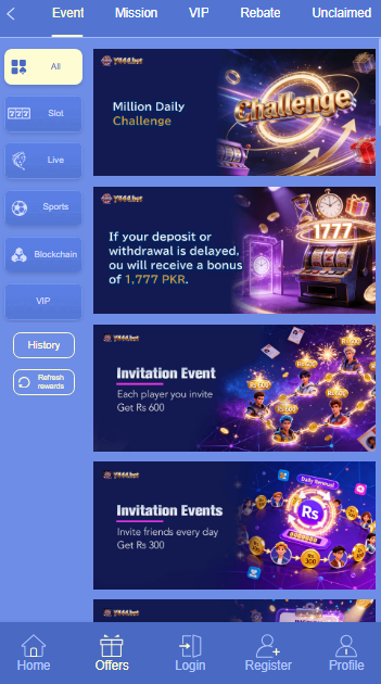 Daily login rewards, welcome bonus, referral commission, and special events.